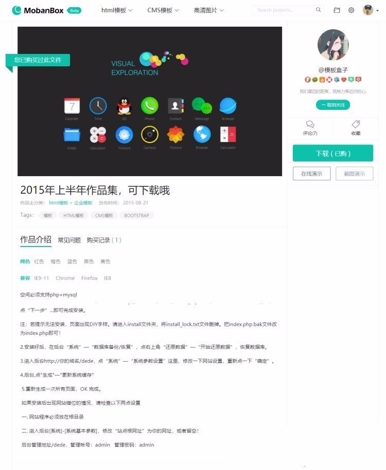 高仿模板盒子VIP付费素材资源类整站源码打包 带后台地址+支付宝接口+推广,最新高仿模板盒子VIP付费素材资源类整站源码打包,适用于图片素材/数字交易平台/模板下载系统/VIP源码类网站使用,本套源码采用php开发功能强大,支持有个人主页,支付宝接口,销售统计等,前端布局采用响应式布局,自适应手机等多终端设备,模板设计风格非常主流和国外模板相差无几,适用于:高端设计网站,高端数字化虚拟交易平台使用!